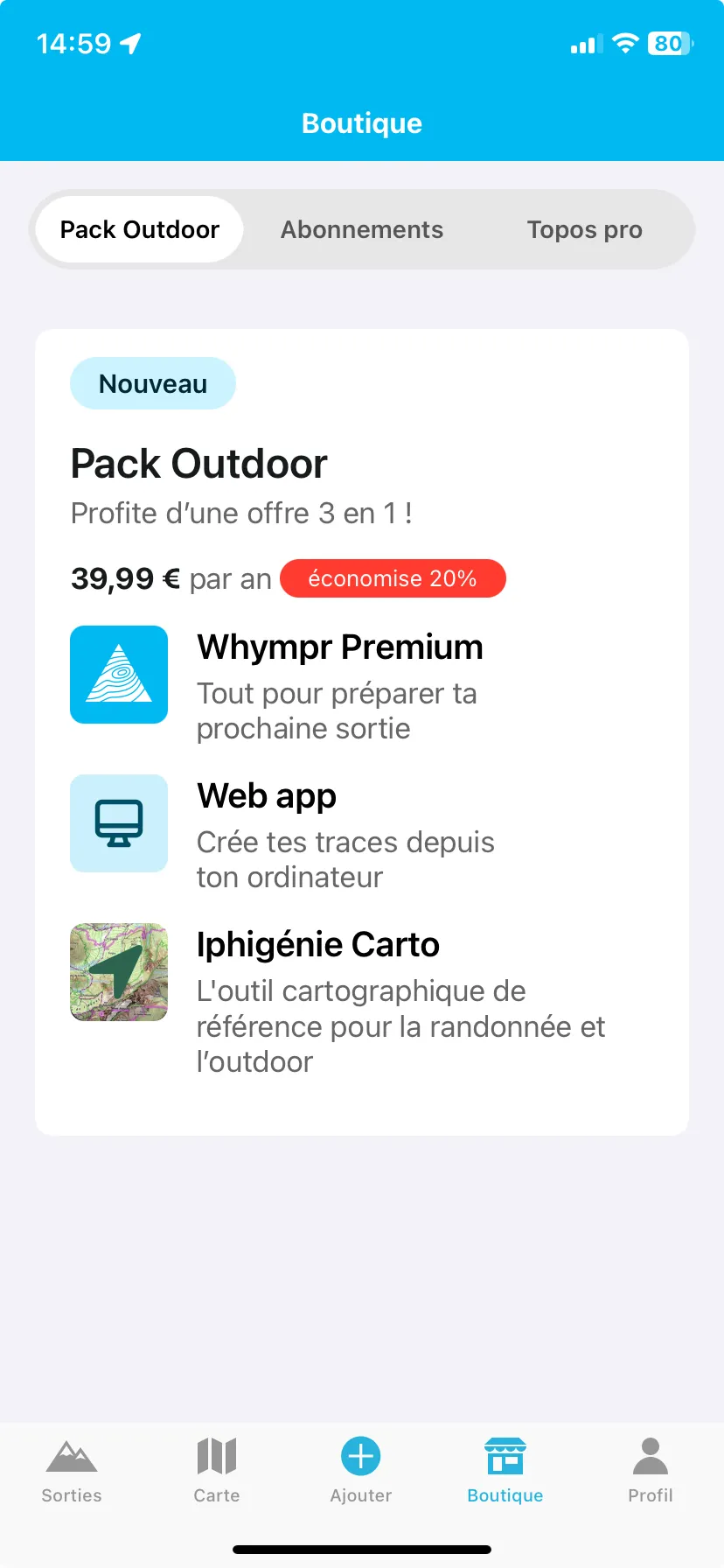 - Filtre plus de 100 000 itinéraires, carte 3D, météo, bulletins avalanche (BERA), webcams outdoor et retours sur les conditions du terrain partagées par la communauté (Whympr)