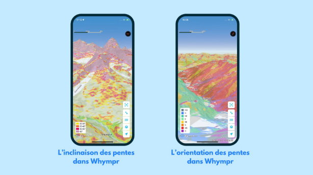 Rends-toi dans l’onglet carte de l’application, puis cliques sur l’icône trois carrés superposés sur le côté de l’écran à doit. Choisit « Calques »en haut de l’écran. Tu pourras alors faire apparaitre les inclinaisons ou les orientations des pentes. Profite en pour jeter un œil aux autres calques ! Tu trouveras par exemple celui des zones de natures sensibles pour éviter de skier sur les lagopèdes.