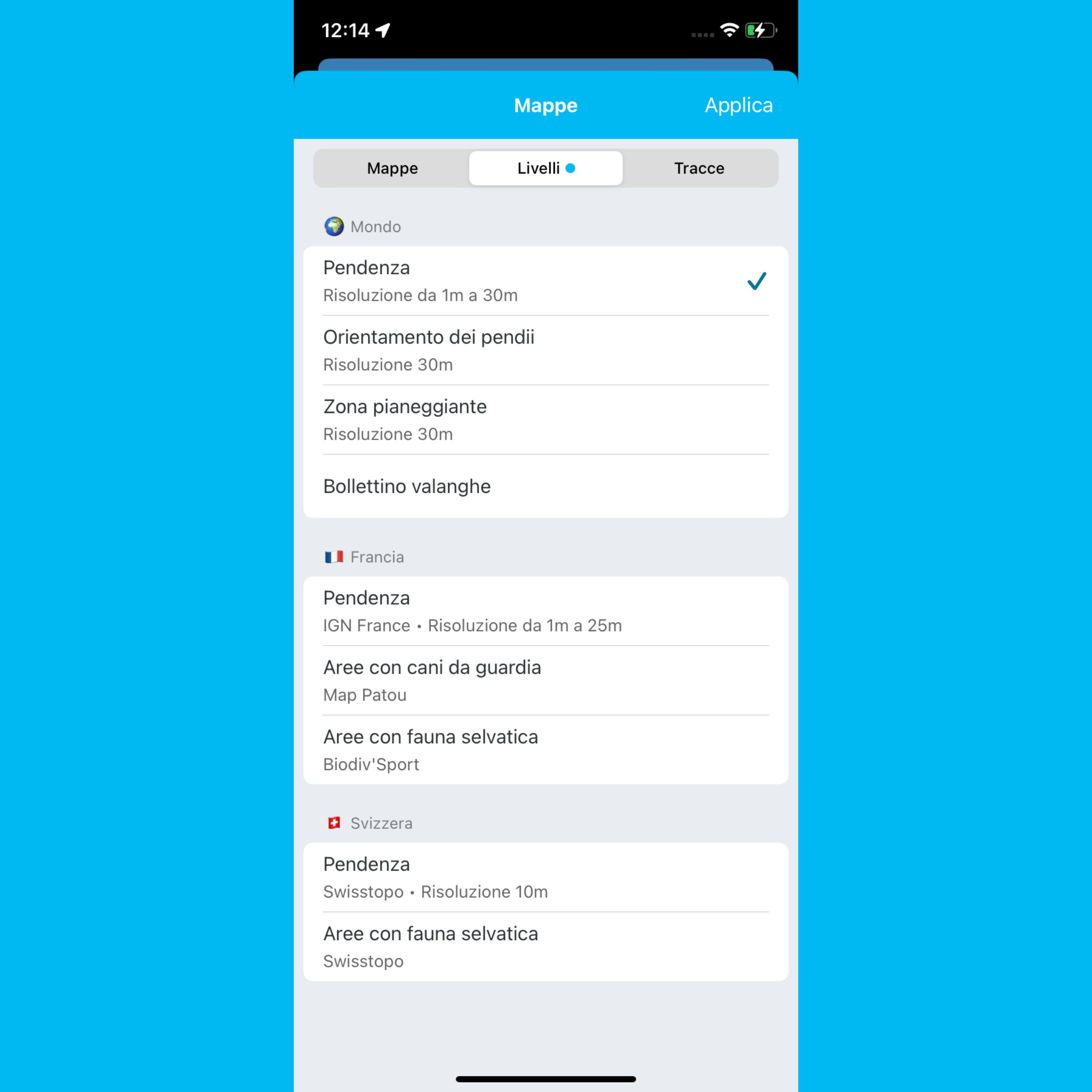 Per rendere più chiara la comprensione dei dati utilizzati, nel menu di selezione dei layer sono state aggiunte informazioni esplicite, che indicano la risoluzione di ciascun layer. Riteniamo che questo livello di trasparenza sia importante e dovrebbe diventare uno standard per tutte le app outdoor.